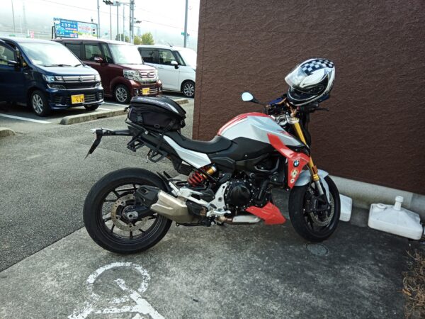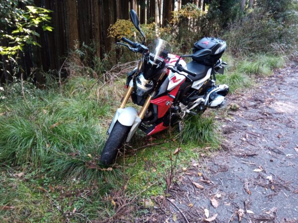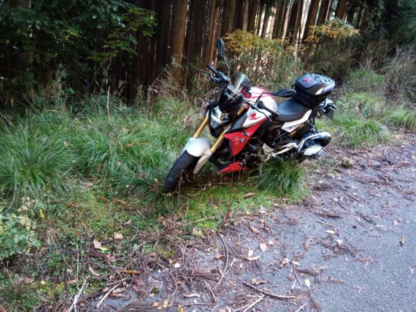 バイクを駐めた場所に戻ってきました。帰り道では急斜面を降りたくなかったので、林道が間近に見えるまで尾根を進み、バイクを駐めていた辺りで斜面を滑り降りました。往復で約38分かかりました。