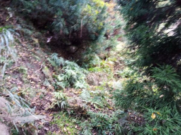 100mほど戻って、かなりの急斜面ですが、登れそうな場所を見つけました。右斜めに登って行けそうな感じだったのですが、途中から木もろくに生えていない急斜面を、草を掴みながら四つん這いで登る羽目になりました。