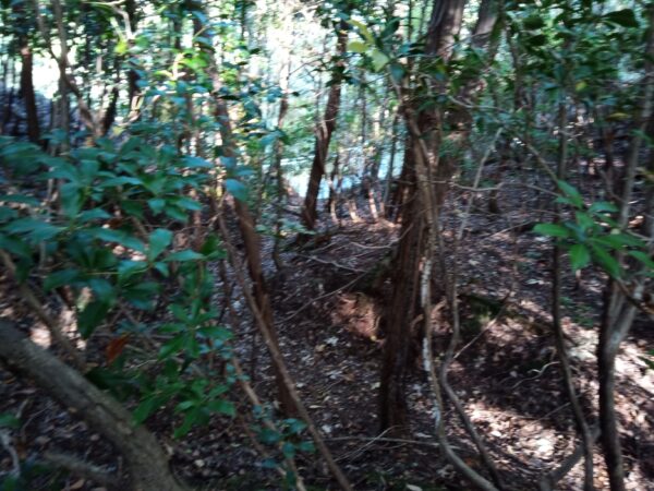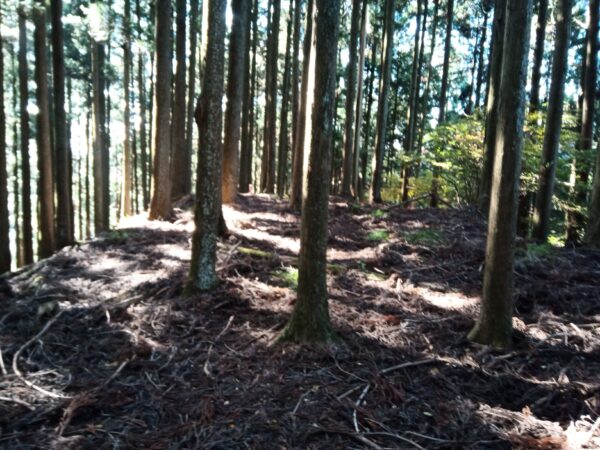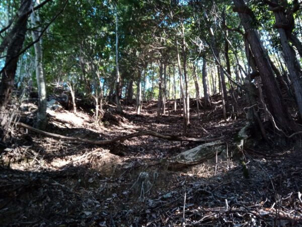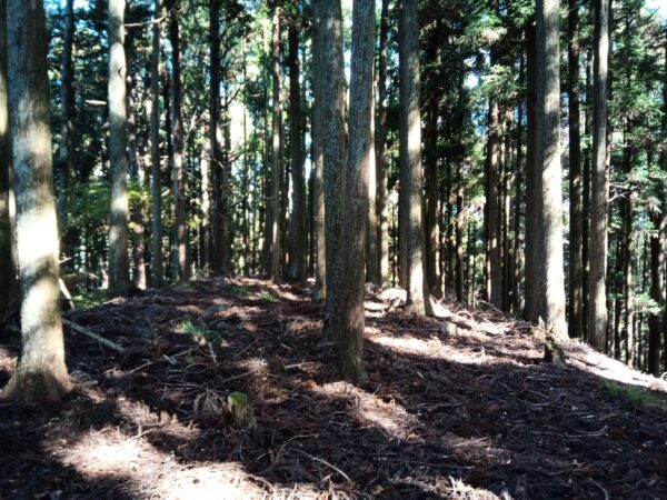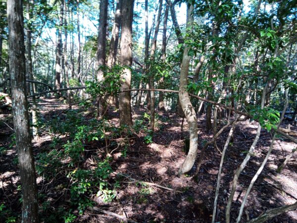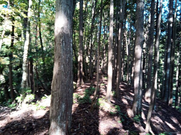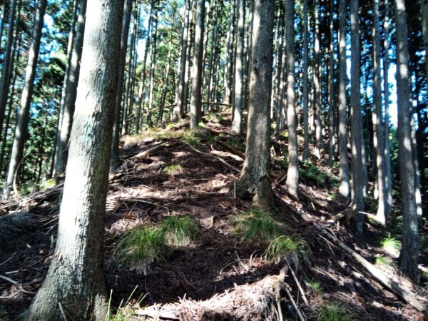 急斜面を死ぬような思いで登り切ると尾根に到着しました。グーグルマップで「宇津嶽山城址」の位置を確認しながら尾根伝いに進みます。多少のアップダウンや倒木はありますが、楽に進めました。