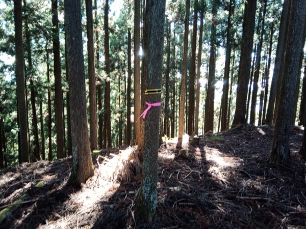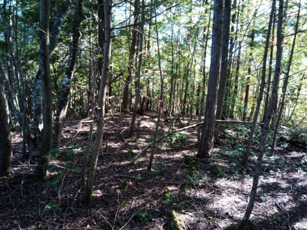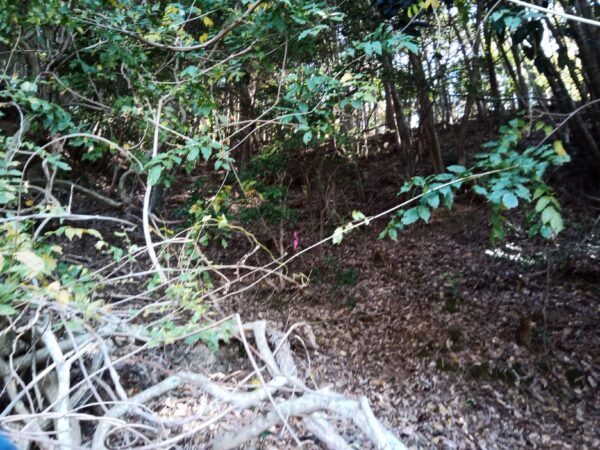 「世木林城址」に到着。林状態で、説明看板等はありません。位置はグーグルマップで確認し、目印として赤いリボンを結んでおきました。バイクを駐めた場所から約17分かかりました。