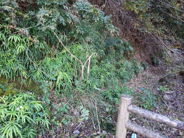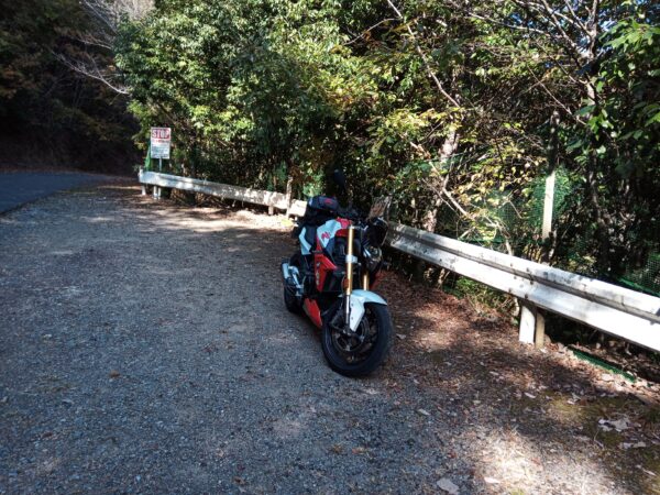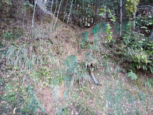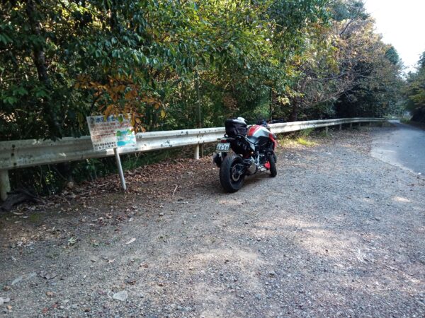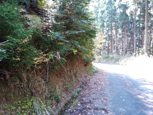 バイクは林道にエスケープゾーンに駐めているのですが、グーグルマップ上で見当を付けていた登り口は少し戻ったところなので、徒歩で戻りました。この林道は山を切り開いて造ったようで、山側はほとんど絶壁になっていて登れません。