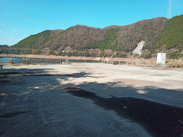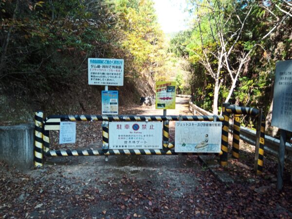 「世木林城址」のある半島を進むと、ゲートで通行止めになっているので、その手前の広場に駐めました。水上バイクで暴れるアホや無法なバス釣りなどのせいで通行止めになったようです。