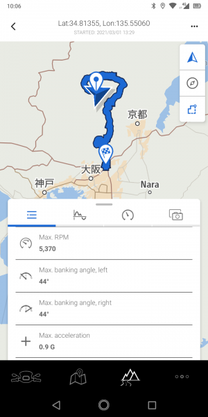 F900Rはスマホの専用アプリ(BMW Motorrad Connected)と連動して、バイクの動きを記録できるんだけど、それを確認したら左右44度のバンク角が記録されていました。