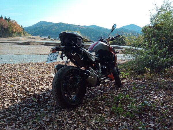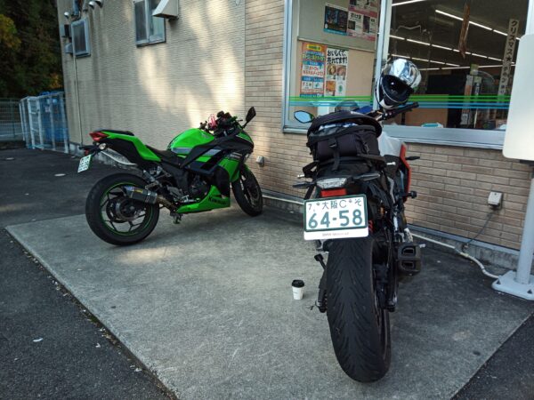 今回は亀岡市の西部なので「ファミリーマート亀岡本梅町店」でコーヒー休憩と昼食の調達です。いちおう晴れの予報なのですが、気温が12℃くらいしかなく、グリップヒーターのありがたみを感じました。