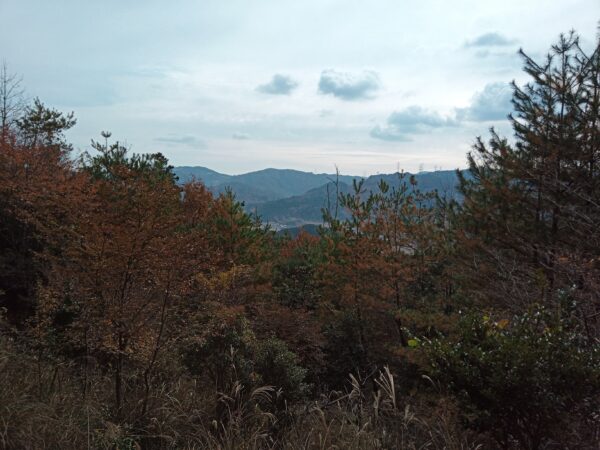 途中の景色です。林道を進みながら登るので、景色がだんだん良くなります。また、かなり大きな岩が点在します。林道も石混じりなので、この山は岩山なのかも知れません。