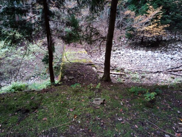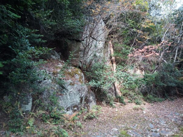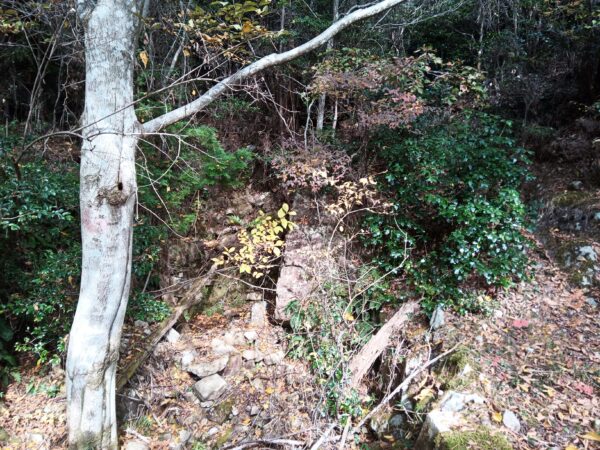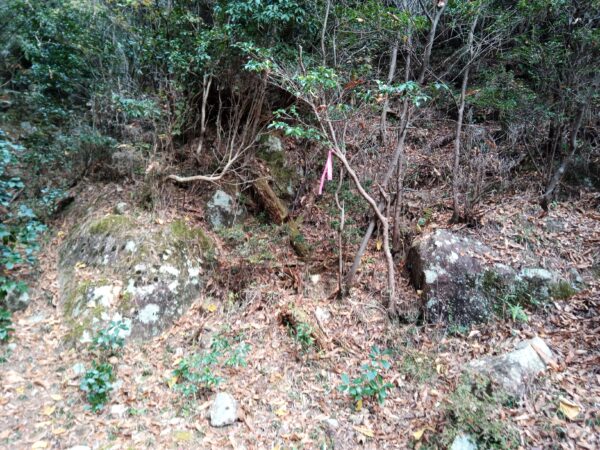 砂防ダムに着く少し手前に、グーグルマップ上で「数掛山城址」に一番近そうな場所がここでした。実際に城址からの帰り道に、林道に向かって真っ直ぐ降りてきたら、ここに出ました。ただ、石や岩が多くて登りにくそうに見えました。
