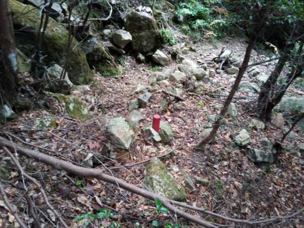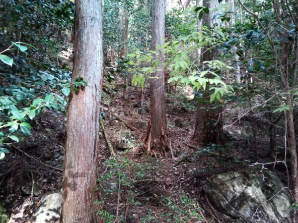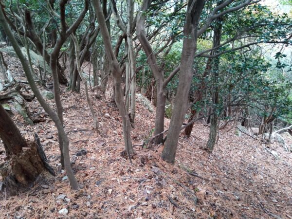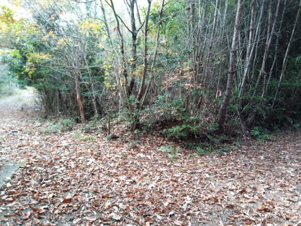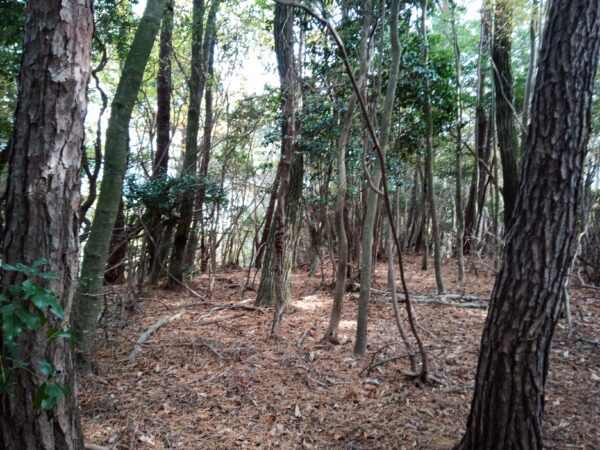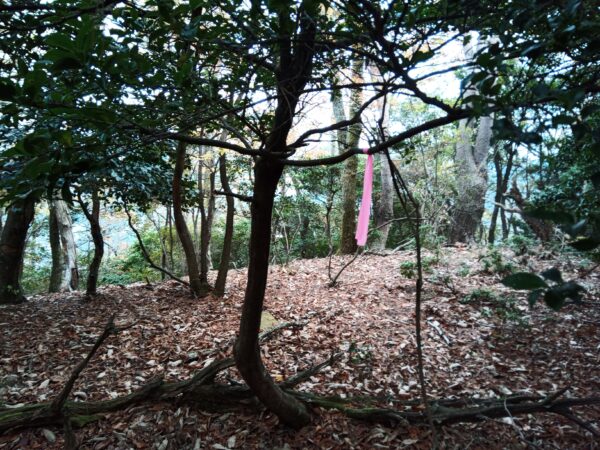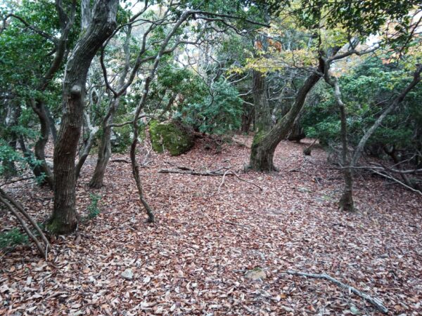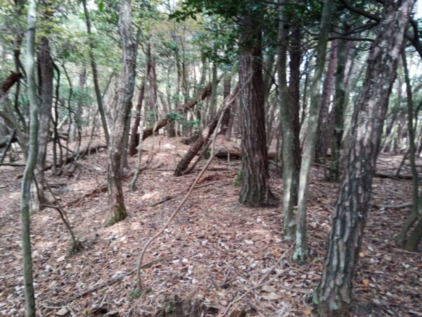 このあと山の中で迷って、城址らしき場所を2ヶ所ほど見つけたため、またグーグルマップの位置が違うのかもと悩みました。下の2枚の写真が、城址かも? と思った2ヶ所です。一度尾根に登ると降りるのが嫌なので、なるべく尾根伝いに進んだため、登った場所から城址まで大きく右回りに迂回する羽目になりました。