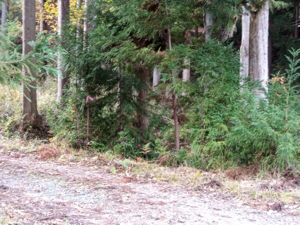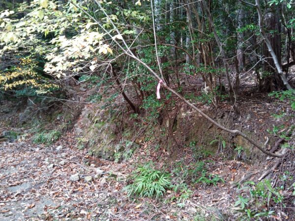 林道に出ました。登りで城址への最短距離だと思った場所でした。目印として赤いリボンを結んでおきました。