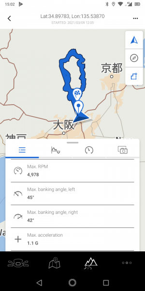 タイヤのグリップも上々なので気持ちよく走れました。で、左側だけだけど、バンク角45度がでました。