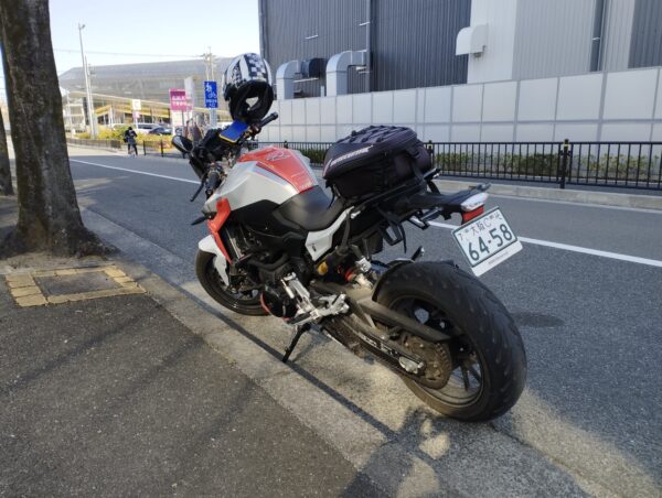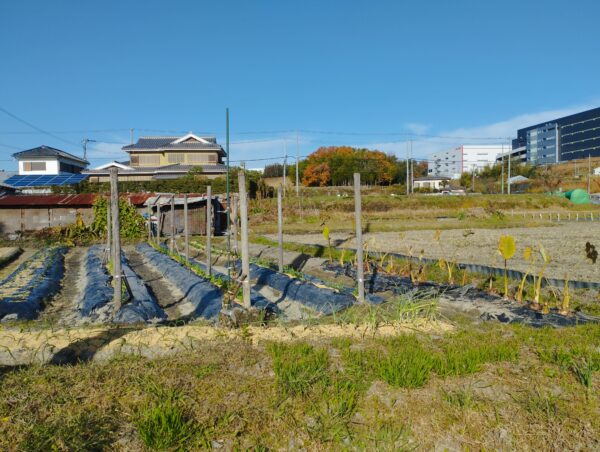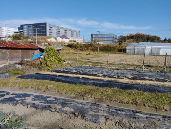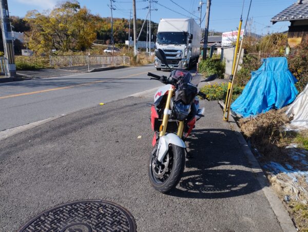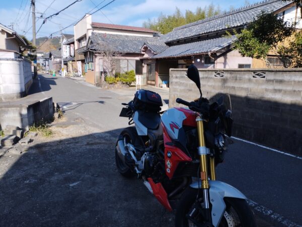 「太田城址」は「イオンタウン茨木太田店」の北側にあります。事前にパソコン版のグーグルマップでも確認していたのですが、北に入る細い道を見つけるのが難しかったです。バイクは道端に駐車しました。道路の反対側にある建物が「イオンタウン」です。