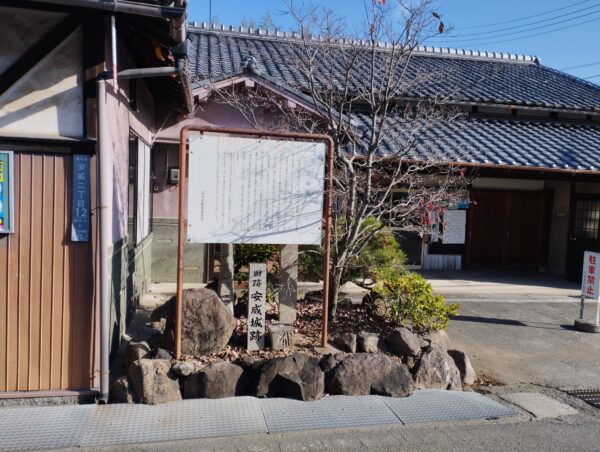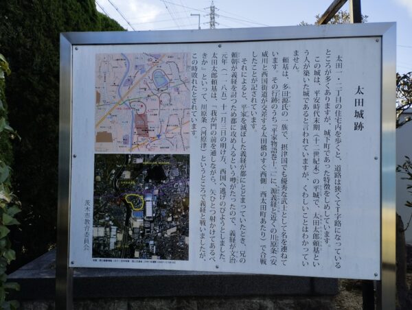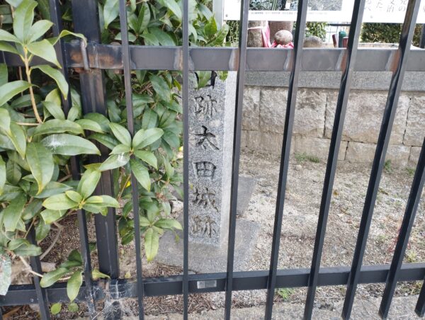 「太田城址」はこの場所から少し戻って、細い路地を北に上がった所にあります。お地蔵様の祠みたいなものがありましたが、実質石碑と説明看板だけです。