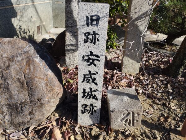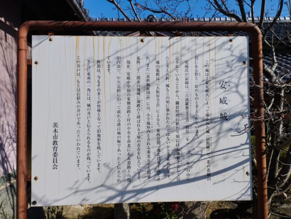 「安威城址」の石碑と説明看板です。城址の外郭はほとんど竹林になっているらしいのですが、確かに実家(亀岡市)に帰る道の左手(「安威城址」の東側に該当。)には竹林がありました。