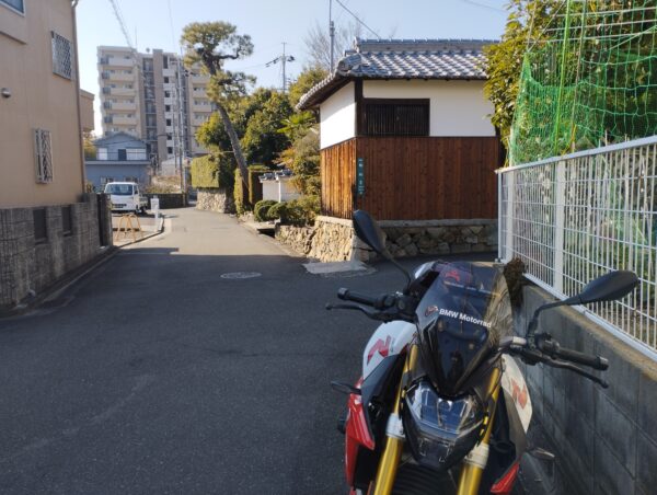 「芥川城址(平城)」は、ちょっと立派なお屋敷の前に城跡碑があるだけです。道が狭いので、少し離れた道端にバイクを駐めました。バイクの向こうに見えるのがお屋敷です。