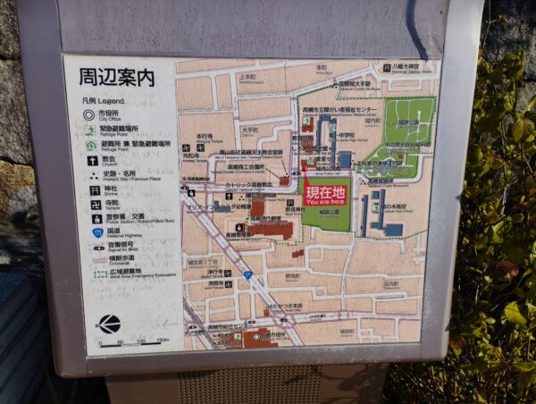 周辺案内図です。「高槻城址」の城跡碑は「高槻城公園」内ではなく、隣接する「槻の木高校」の敷地内にあります。まあ、この付近一帯が「高槻城址」の敷地なんですけどね。