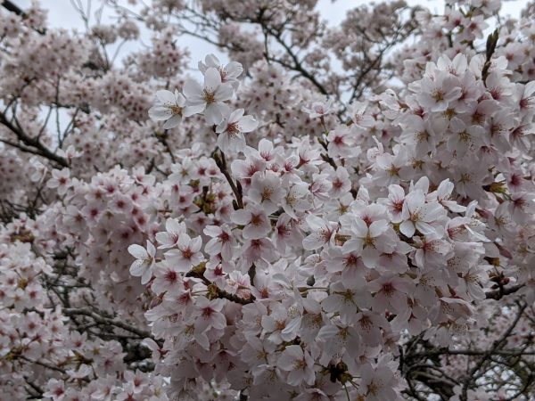 バイクを駐車するスペースがなかったので、隅っこに停めています。桜の咲き具合はというと…。