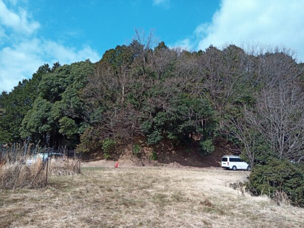 工事事務所を通り過ぎると、正面に城山があります。工事関係者のものと思われる車両と、工事用の車両が駐まっていました。どこから城山に入ろうかとグーグルマップを見ながら考えていると、工事関係者から資材や機械のある付近には近づかないように注意されました。そこで城山の左端から入りました。