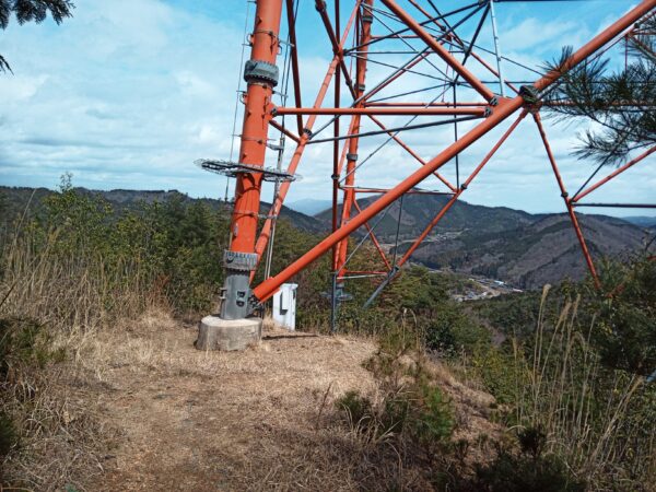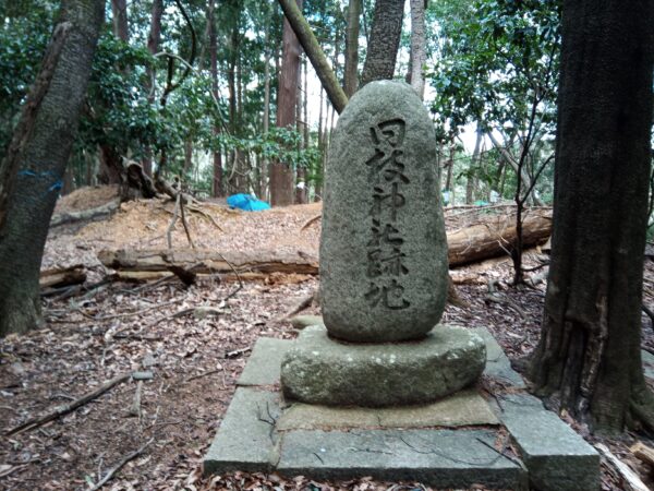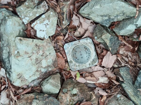 赤いリボンを結んでいたら、攻城された方の案内札を見つけました。すぐ横には「三角点」がありました。