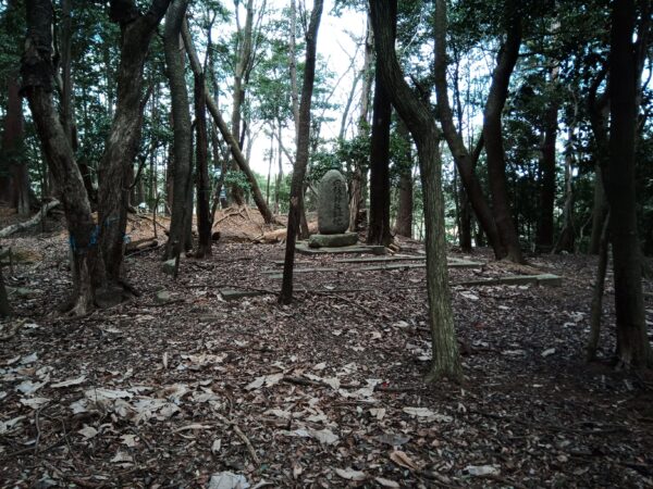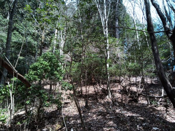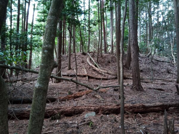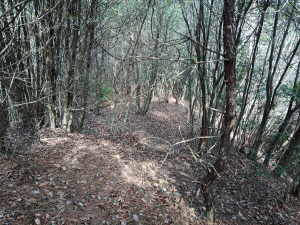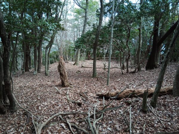 山を直登りして尾根まで上がったら、尾根伝いに左手に進みます。「堀切」と思われる窪んだ所を通過すると、「本郭跡」と思われる場所に着きます。