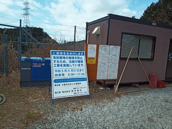 なにやら斜面の法面補強工事をしているようで、看板と工事事務所がありました。