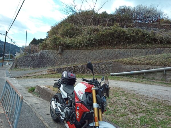 帰りは新名神高速道路を右手に見ながら、バイクを駐めた場所に戻ってきました。往復で約13分かかりました。もう少しゆっくり城址を見たかったですね。