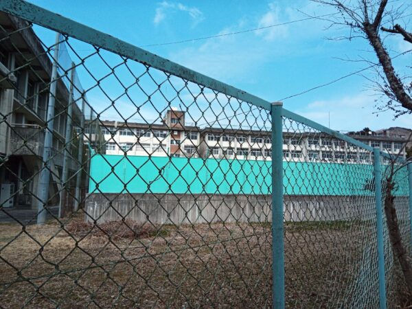 バイクの背後に見える坂道を登って、「淀之水学院 城山キャンパス」まで行ってみました。学校の回りはフェンスがあって、もちろん入れません。校庭の隅っこに看板らしきものと石碑らしきものが見えました。これが城跡碑と説明看板だったらうれしいのですが・・・。