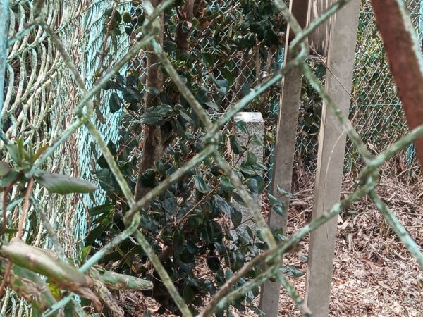 「水牢城址」に到着。バイクを駐めた場所から約12分かかりました。林状態で、案内看板等はありません。目印に赤いリボンを結んでおきました。