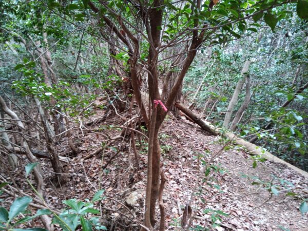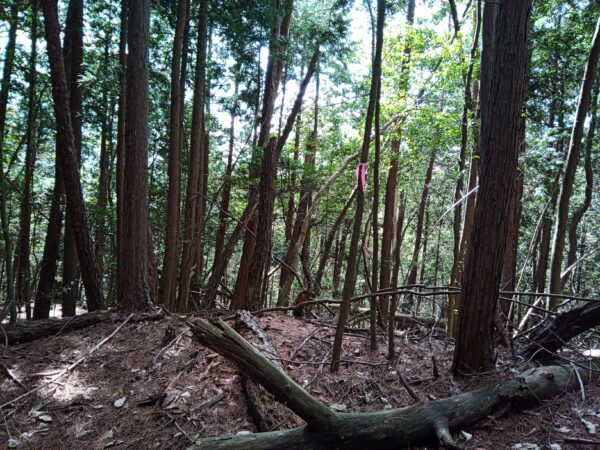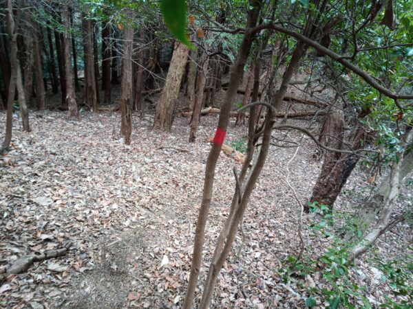「本郭跡」に到着。バイクを駐めた場所から約9分です。「本郭跡」は林状態で、説明看板等はありません。目印に赤いリボンを結んでおきました。