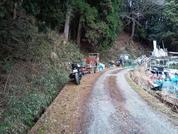 「余野城址」に入れないことは、初めからわかっていたので、「余野本城址」に向かいました。府道109号線を戻って、R423を横切って、狭い林道を進みます。資材置き場らしき場所で林道は行き止まりになり、ここが「余野本城址」の最寄りとなります。道が狭いので、端っこに駐めています。