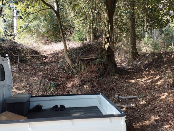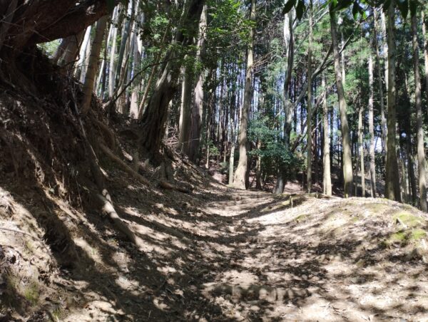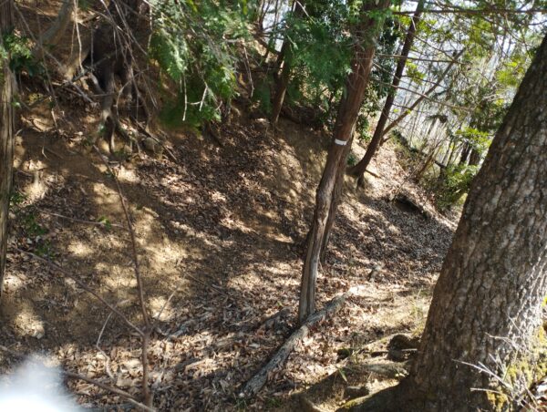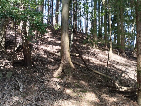 上の写真の竹藪を抜けて、民家を過ぎてからが山登りでした。とりあえず尾根まで登り、尾根を左側(西側)に向かいます。「本郭跡」と思われる小山の手前には「堀切跡」と思われる場所がありました。