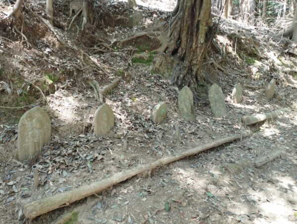 墓地の横から城山を登りました。城山を登り切ると左右に尾根が続いており、最初は左側(西側)に向かいました。「堀切跡」や「本郭跡」と思える場所があったのですが、グーグルマップのマーカーの位置とかなり異なっていたため、道を戻って右側(東側)の尾根に向かいました。