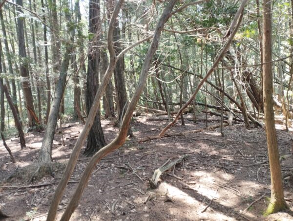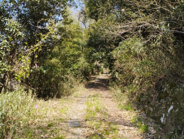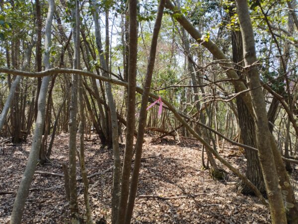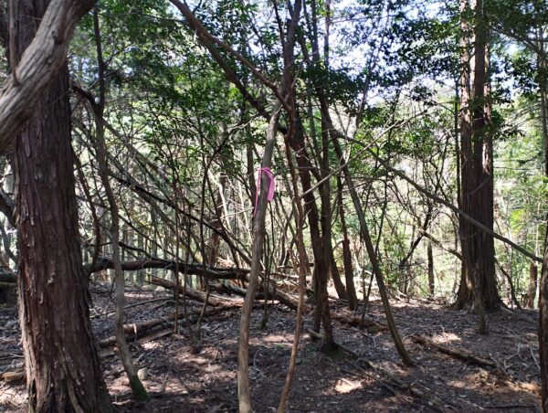 林道を進むと、二つの山とその谷間がある地点があります。過去に訪問された方が赤いリボンを設置してくれているので、見逃すことは無いと思います。そこからは右手の山を直登りするのですが、急な斜面だったため、わたしは谷間を真っ直ぐ進んで、途中から右の山に直登りしました。