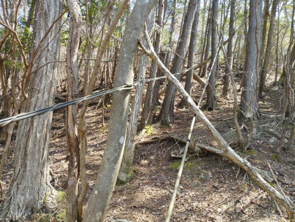 山頂(尾根)に近づくとケーブルがありました。攻城された方のブログに、ケーブル沿いに行けば大丈夫という記述があったのを思い出しました。ケーブルに沿って登ると尾根に到着します。