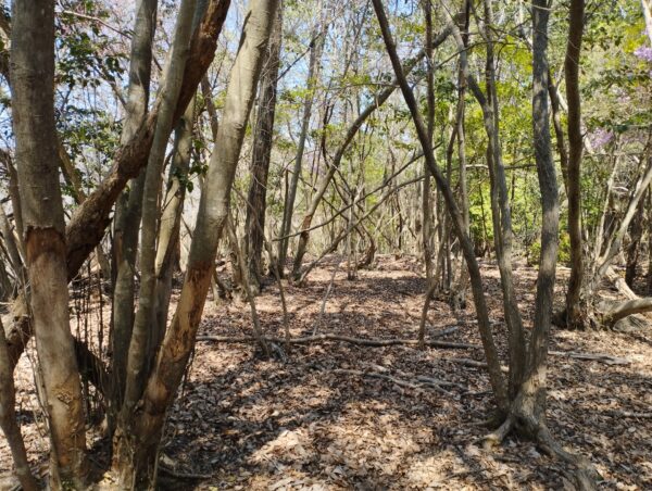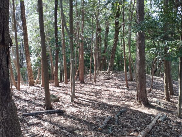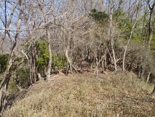 「本郭跡」と思われる場所に到着。なぜ「思われる」なのかと言うと、この場所もグーグルマップのマーカーの位置が合わなかったからです。左右の尾根はY字型になっていて、マーカーはその中間の谷にありました。マーカーが間違っていることは確実ですが、左右どちらの「本郭跡」が正しいのかがわかりません。