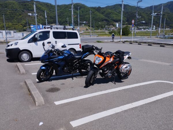 帰りに「ファミリーマート亀岡馬路店」でコーヒー休憩をしたのですが、ホンダのグロムでタンデム・ツーリングをしている熟年夫婦や、スズキのGSX-S1000GT、KTMの250DUKEのにいちゃん達が休憩していました。