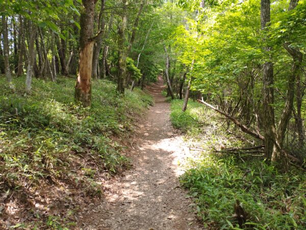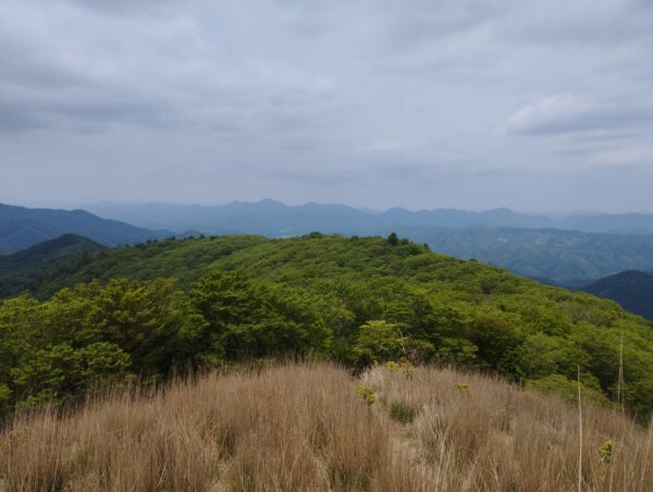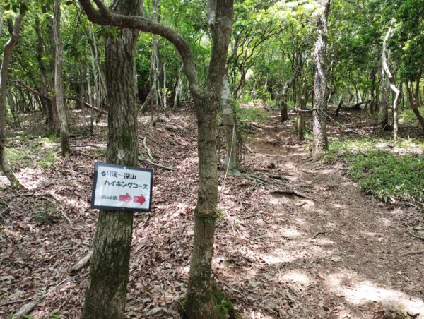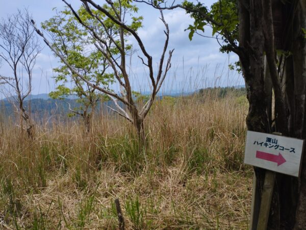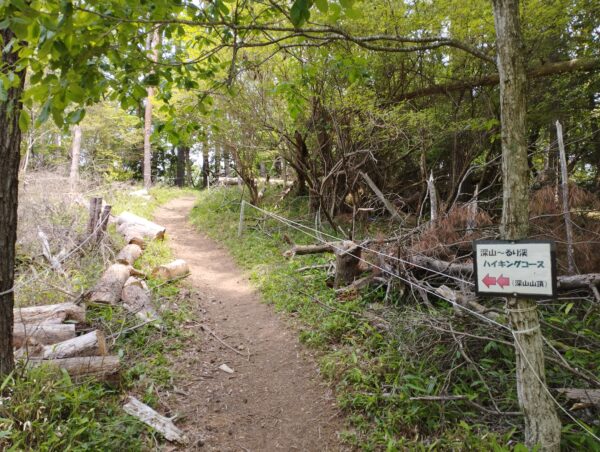 ハイキングコースに入ってから約15分で見晴らしが良い場所にでました。もう周りの山より高いですね。正面の山が「深山」か、と勘違いしそうになりますが、この先は尾根伝いに進むので、「深山」詐欺が続くことになります。