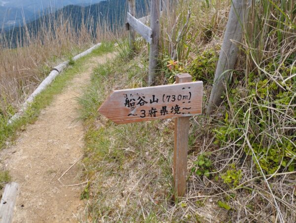 正面の緑の山が「船谷山」です。いちおう道はあったのですが、行きませんでした。この後「深山神社」に戻って、不届きにも本殿に相当する場所の前で昼食をいただきました。