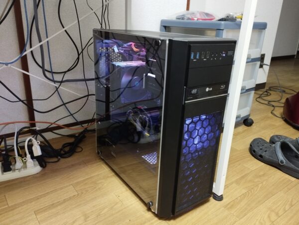 自作パソコンの出来上がりはこんな感じです。ケースの表面の蓋は透明アクリル板なので、配線を隠す必要性がわかりますね。(見映え重視ってことですね。)