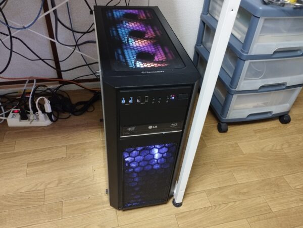 パソコンを組むだけなら半日もかからないのですが、最近の自作パソコンのトレンドは配線を裏側に回すことなので、下手に配線するとケースの裏側の蓋が閉まらなくて大変でした。今回はエアフローにも気を遣ったので、LEDで光るケースファンを増設してみました。