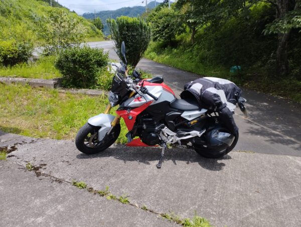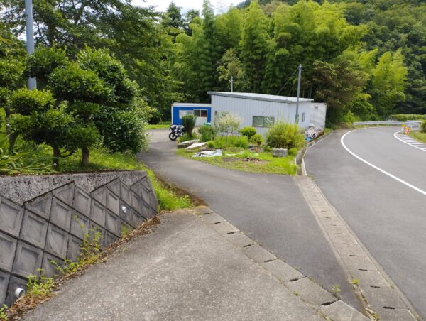 参道を降りて、脇道を歩いて、バイクを駐めた場所に戻ってきました。この写真だと倉庫の前に駐めているのがわかりますね。往復に約14分かかりました。