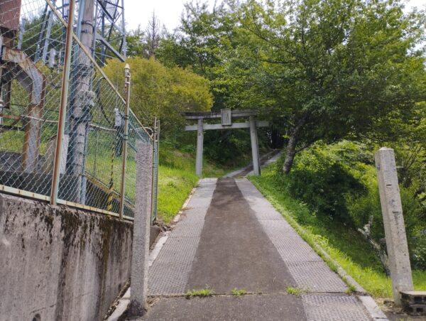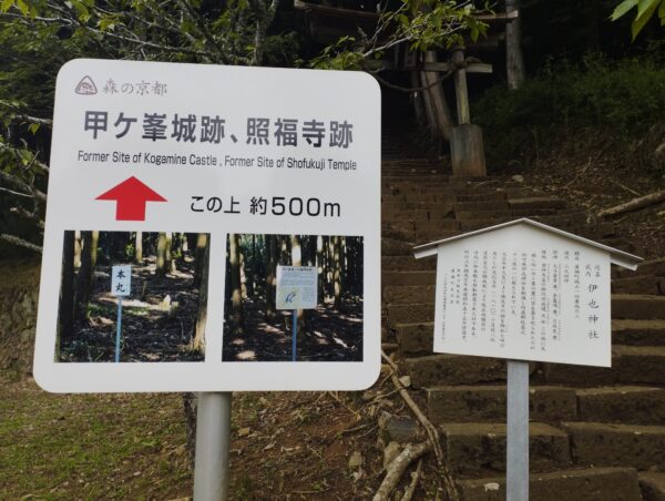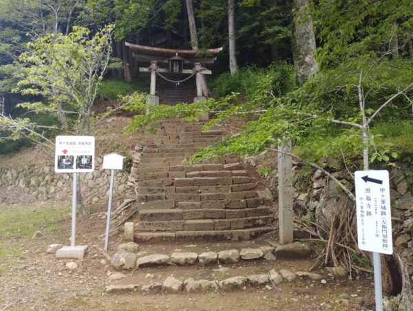 では、「甲ヶ峯城址」に向かいます。「甲ヶ峯城址」は「山家城址」の向かいにある「伊也神社」の参道から登って行きます。道は整備されていて、何カ所か倒木がありましたが、下をくぐって通過できるレベルでした。