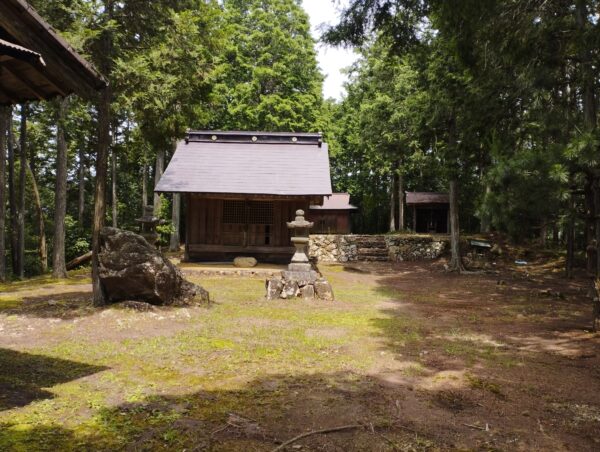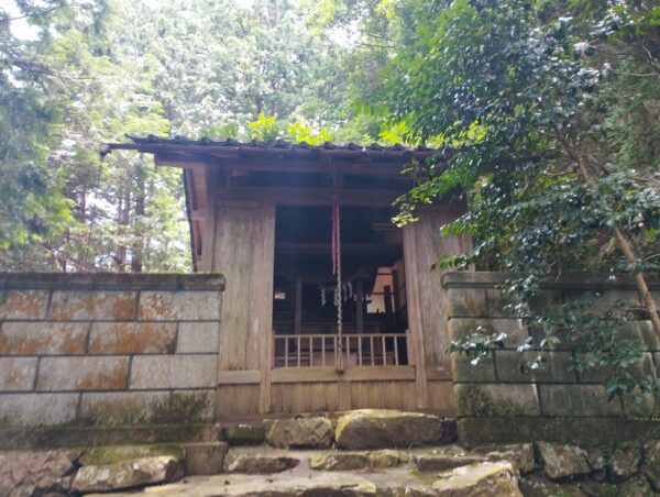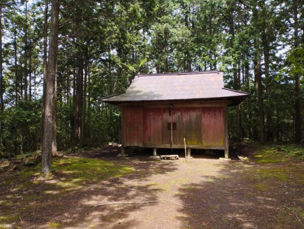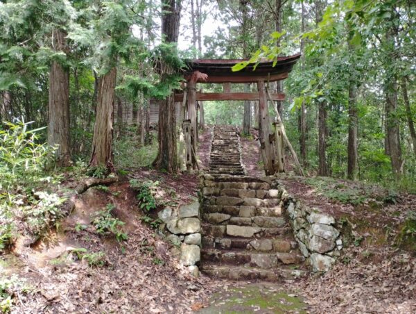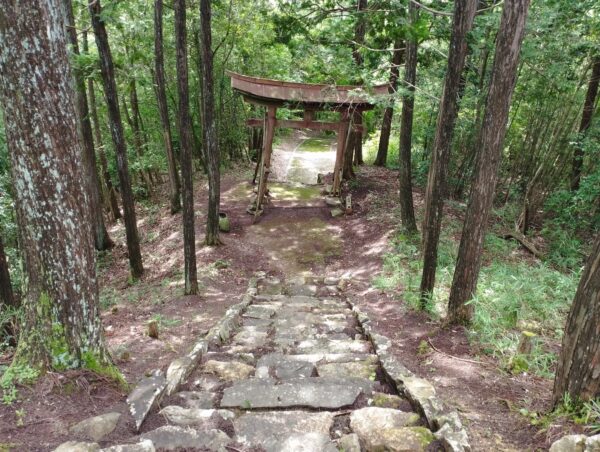 鳥居をくぐって少し登ると「伊也神社」があります。いちおう参拝がてら訪問しました。ここで戻るのが面倒になり、神社の裏側にも道があるのでは? と思ったのが運の尽きで、登城道に戻るのに山を直登りする羽目になりました。