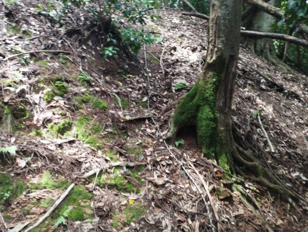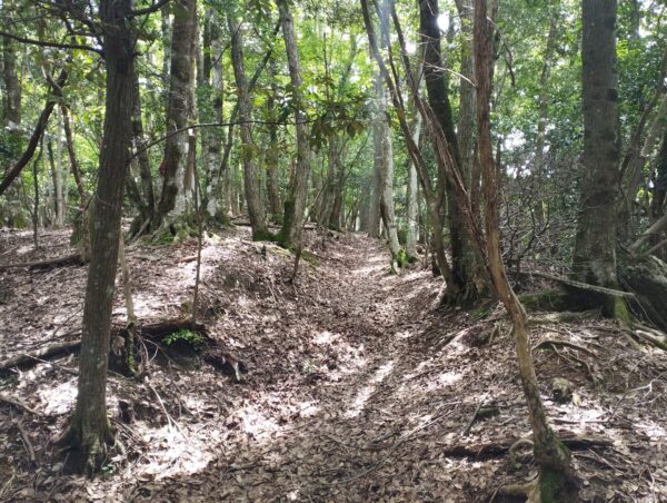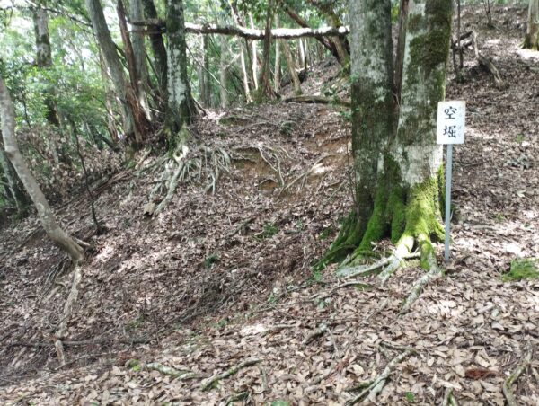 この先に「照福寺跡」があるのですが、寺と言いながら砦としての機能を有していたらしく、「土塁」「空堀」「虎口」などが設けられています。こちら側の「空堀」はものすごく深く掘られており、訪問者の補助として黄黒のトラロープが設置されていました。