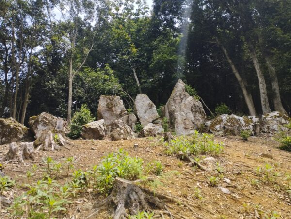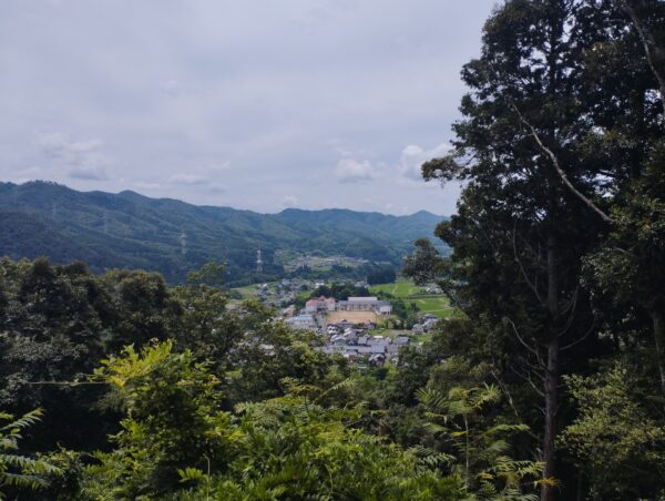 途中で巨石群のある場所がありました。麓側の樹木が伐採されているので、ここだけは景色が良く見えました。まだそんなに登っていませんが「山家城址」自体が高い場所にあるのがわかると思います。