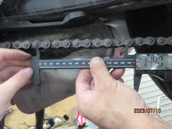 4.チェーン延びの限界値はMAX144mmだが、145.6mmと1.6m限界値を超えているので、スプロケも含めて交換した方が良い。→ モンスターも3万キロくらいでチェーン交換をしているので、そろそろかなと思っていました。でもディーラーは高いので「茨木2りんかん」での交換を予定しています。