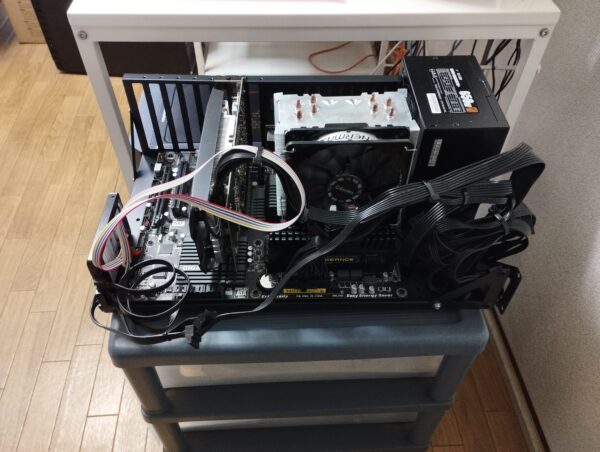 オープンフレームの品質は、さすがの中華製でかなり歪んでいましたが、なんとかマザーボードや電源を組むことができました。電源が古くてプラグイン方式ではないため、使用しない電源ケーブルをまとめるのに苦労しました。左側の白地にカラーの縞があるケーブルは、スイッチ(電源とリセット)やLEDランプ(電源とHDD)です。