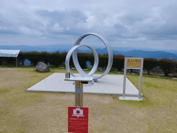 天文台の後ろ側に「恋人の聖地」のモニュメントがあり、記念撮影用のカメラ台まで設置されています。2つのリングが繋がっている意匠は、いかにも「恋人の聖地」のモニュメントらしい感じです。