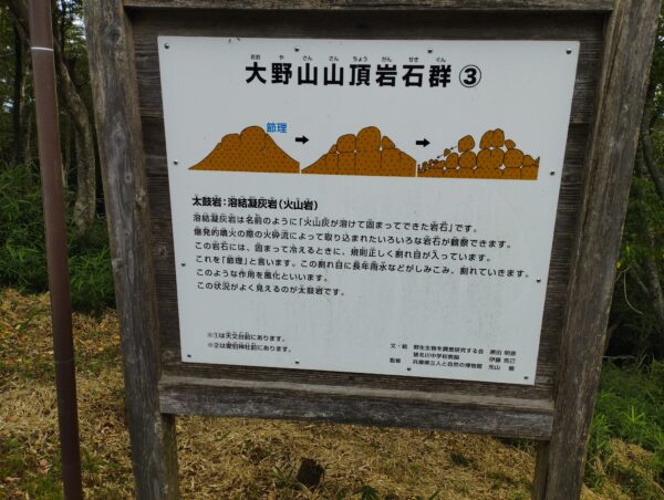 「大野山岩めぐり遊歩道」の入口です。遊歩道は車道に沿っているので、車道に降りることができる場所が何カ所かあります。もちろんわたしは遊歩道の出口から車道に戻りました。