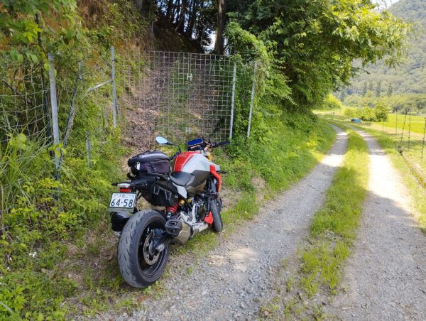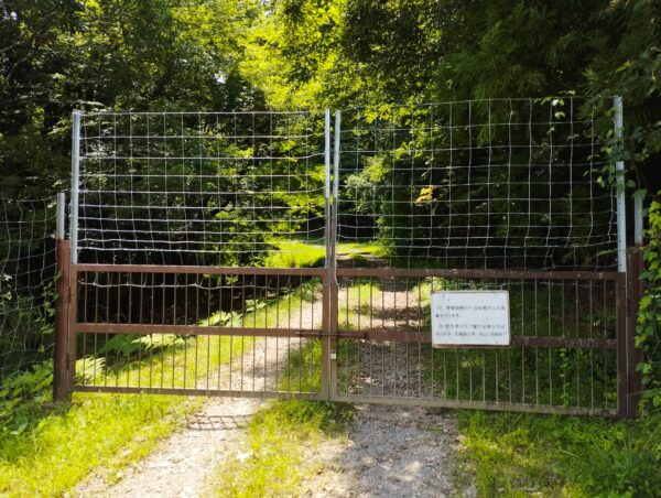 バイクを駐めた場所から50mくらい南に進むと害獣対策フェンスがあり、通行止めになっていました。これまでの経験から、害獣対策フェンスは開閉可能な物が多いので期待していたのですが、4桁のダイヤル鍵がかかっていて、左右にも人が通れそうな隙間はありませんでした。