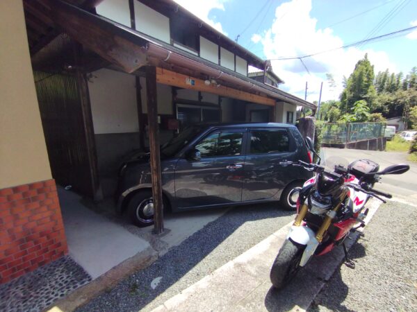 昼食を購入したものの適当な休憩場所が見当たらなかったため、実家で食べることにしました。妹さんが在宅だったので新車の軽とのツーショットを撮ってみました。