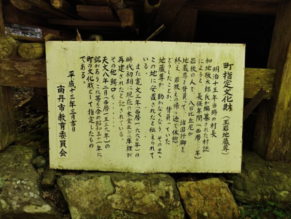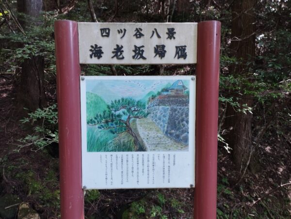 ここからは徒歩で「玉岩地蔵堂」に向かいます。すぐに「海老坂帰鴈」の説明看板があります。「帰鴈」はおそらく「きがん」と読み、北へ帰る「雁」のことのようです。この道は「鯖街道」であり「海老坂峠」を越えて小浜方面へ通じる道のため、多くの人夫が連なって進む姿を「雁」に例えたのでしょうか。